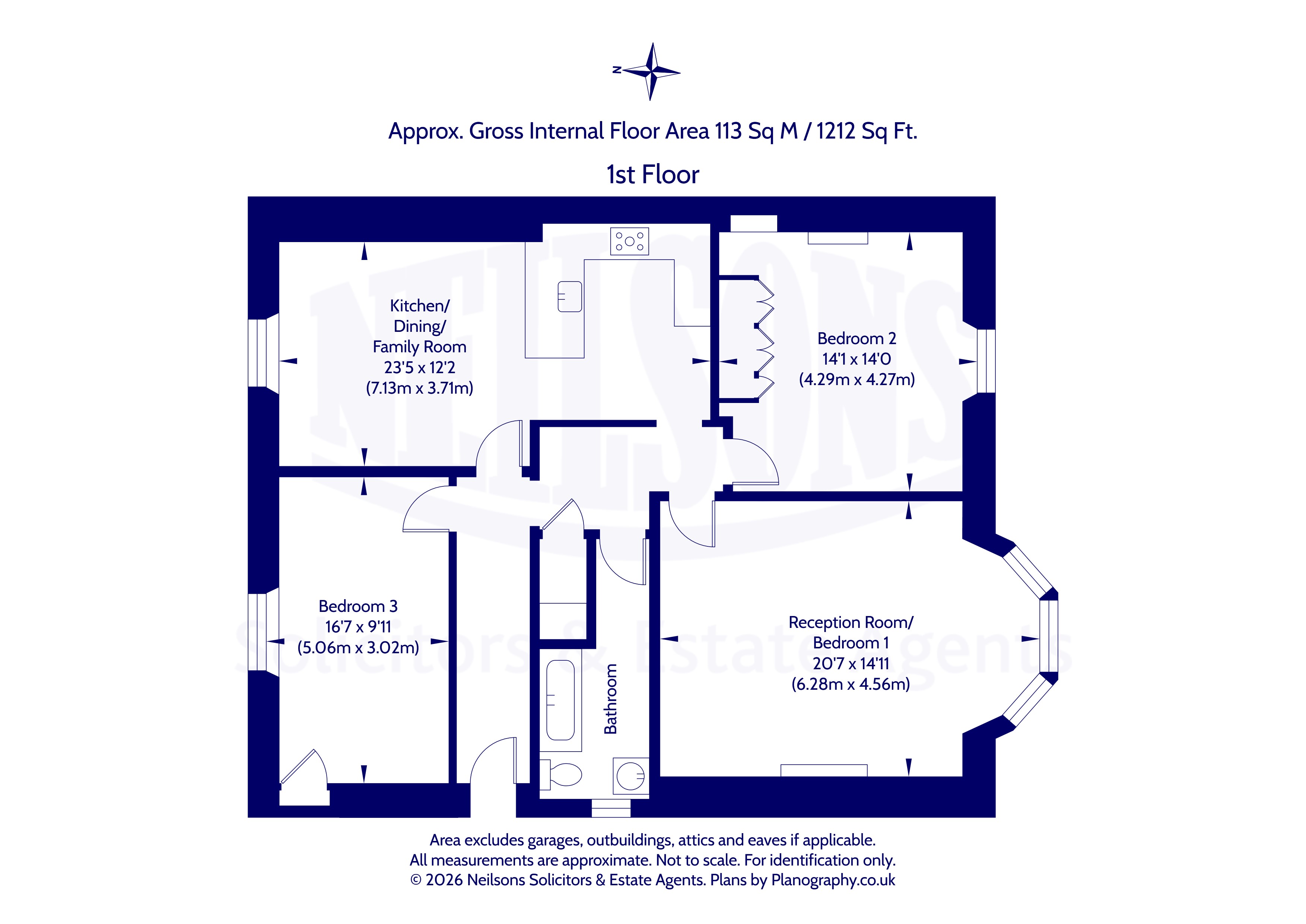 The property boasts impressive proportions, extending over 1200 square feet and featuring high ceilings throughout, further enhanced by attractive period features including fireplaces and cornicing and well maintained fixtures and finishes including real wood and slate flooring. The large bay windowed room to the front enjoys a southerly aspect and can be used flexibly, as either a large double bedroom or as a reception room, featuring a log burner, perfect for cosy evenings during the cooler months. To the rear, the superb open plan kitchen/dining/family room offers the perfect setting for both family life and entertaining, with a window seat overlooking the gardens. The kitchen area is fitted with a good range of shaker style wall and base units with the appliances included, with a breakfasting bar ideal for informal dining. There are two further generous double bedrooms, with the principal bedroom to the front featuring built-in wardrobes. A luxurious bathroom with stained glass window, white suite, spa bath and over bath shower completes the internal accommodation. The property benefits from gas central heating throughout, and sash and case double glazing with the exception of the stained glass window in the bathroom.